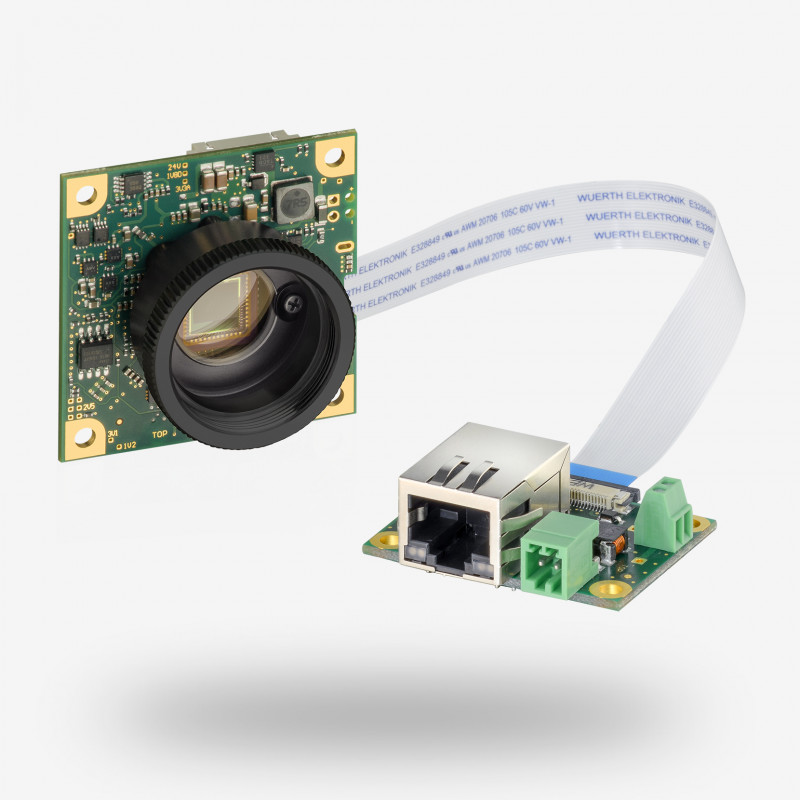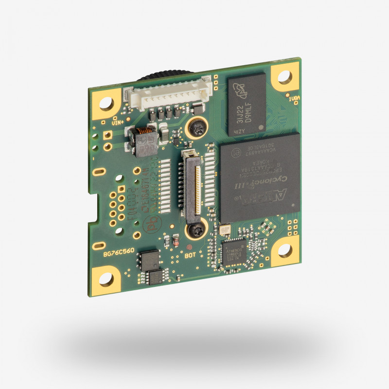 The motherboard including the sensor is separated from the daughterboard including the GigE interface by a flex ribbon cable. Both the flex ribbon cable and the daughterboard are optionally available. The motherboard with single-board GigE camera UI-5244LE including CS-mount and glass filter is suitable for applications in very small or angled spaces. It features a 1/1.8" CMOS sensor by e2v, available as NIR version (EV76C661) or colour/monochrome version (EV76C560). Providing 1.3 MP resolution (1280 x 1024), frame rates up to 50 fps and compact dimensions of 45 x 45 mm, the camera is the perfect solution for OEM projects.